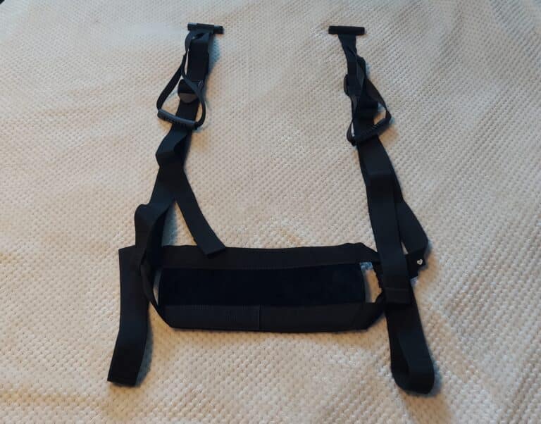 The swing is easy to set up and adjust, and it feels stable. The swing was somewhat difficult for both of us to get in and out of even though we are both relativly athletic. The swing is comfortable for short sessions but I wouldn’t want to sit in it for longer than a half hour. Because the swing has to be used with a closed door the positions it can be used for are limited .